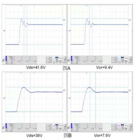 圖2-A表示的是開(kāi)關(guān)管Q1沒(méi)有加RC吸收電路的Vds電壓波形,圖中明顯的看出,當(dāng)開(kāi)關(guān)管Q1斷開(kāi)時(shí),Vds電壓迅速上升至最高點(diǎn),而后伴隨這震蕩下跌,震蕩頻率為20MHZ。