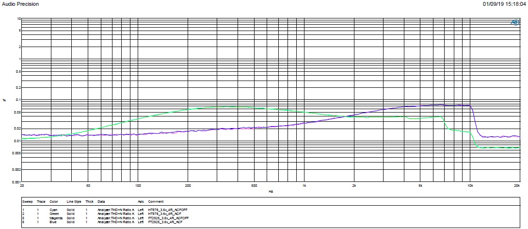 3. 整個頻段THD測試,F(xiàn)T2925低頻失真度小,HT878高頻失真度小。