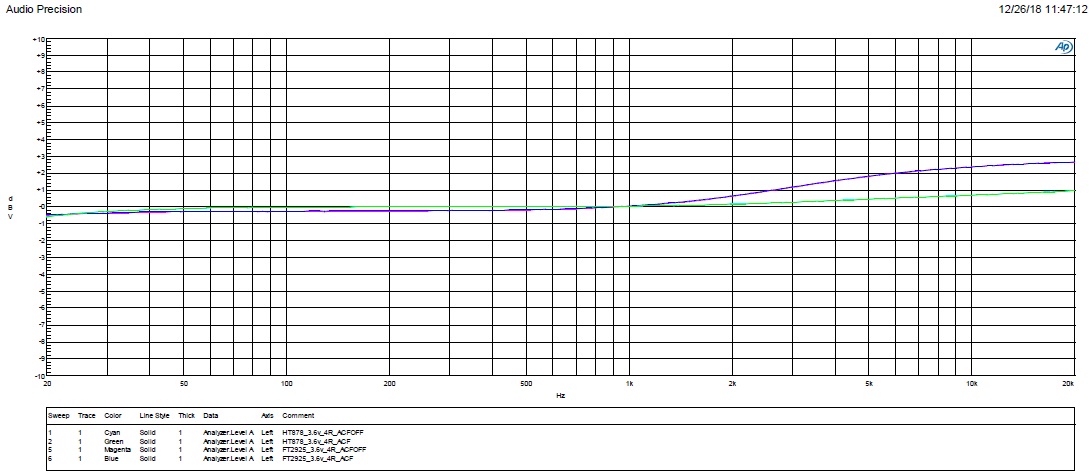 4. 頻響測試,HT878整個頻段相對平坦,F(xiàn)T2925高頻有相應提升。