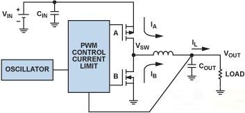 在圖 3 中,開關(guān) A 和開關(guān) B 分別利用 PFET 和 NFET 開關(guān)實(shí)現(xiàn),構(gòu)成一個(gè)同步降壓調(diào)節(jié)器!巴健币辉~表示將一個(gè) FET 用作低端開關(guān)。用肖特基二極管代替低端開關(guān)的降壓調(diào)節(jié)器稱為“異步”(或非同步)型。處理低功率時(shí),同步降壓調(diào)節(jié)器更有效,因?yàn)?FET 的壓降低于肖特基二極管。然而,當(dāng)電感電流達(dá)到 0 時(shí),如果底部 FET 未釋放,同步轉(zhuǎn)換器的輕載效率會(huì)降低,而且額外的控制電路會(huì)提高 IC 的復(fù)雜性和成本。