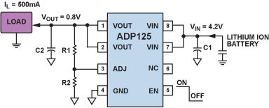 電池的續(xù)航時(shí)間是新型便攜式設(shè)備設(shè)計(jì)高度關(guān)注的一個(gè)特性。提高系統(tǒng)效率可以延長電池工作時(shí)間,降低更換或充電的頻度。例如,一個(gè)鋰離子充電電池可以使用ADP125 LDO以 0.8 V電壓驅(qū)動(dòng)一個(gè) 500 mA負(fù)載,如圖 6 所示。該LDO的效率只有 19% (VOUT/VIN × 100% = 0.8/4.2 × 100%)。LDO無法存儲未使用的能量,因此剩余的 81%的功率(1.7 W)只能以熱量形式在LDO內(nèi)部耗散掉,這可能會(huì)導(dǎo)致手持式設(shè)備的溫度迅速上升。如果使用ADP2138 開關(guān)調(diào)節(jié)器,在 4.2 V輸入和 0.8 V輸出下,工作效率將是 82%,比前一方案的效率高出 4 倍多,便攜式設(shè)備的溫度升幅將大大減小。這些系統(tǒng)效率的大幅改善使得開關(guān)調(diào)節(jié)器大量運(yùn)用于便攜式設(shè)備。