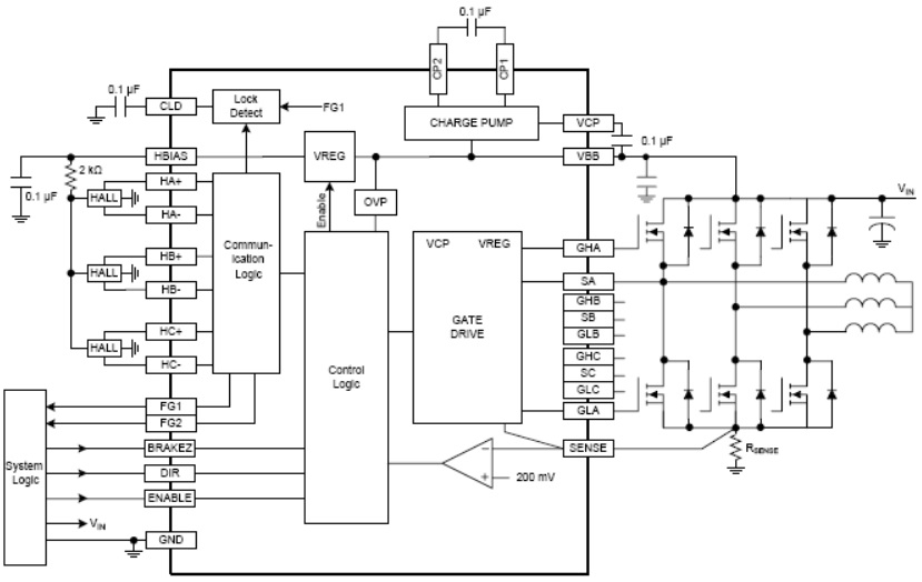 當配備噪音過濾以防止錯誤整流信號時,可采用價格低廉的霍爾元件。A4931 可提供 7.5 V 穩(wěn)壓電源,以向三個霍爾元件供電。