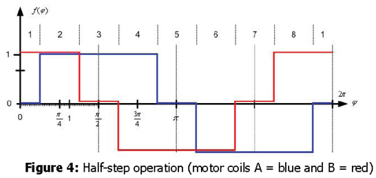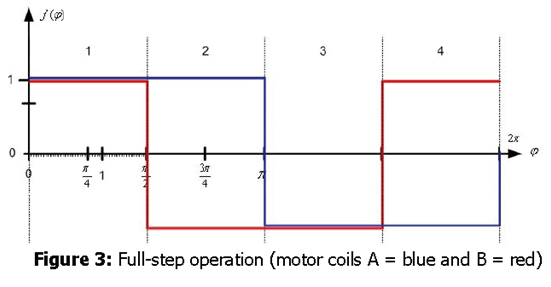 典型的步進(jìn)電機(jī)有50個(gè)極(Poles),就是200個(gè)整步(Full Steps) ,也就是整步情況下每步1.8°角度,電機(jī)旋轉(zhuǎn)一周需要360°.但是也有些步進(jìn)電機(jī)的步距角更小比如整步需要800步的.起初 這些步進(jìn)電機(jī)被用作整步或者半步模式下,矢量電流提供給電機(jī)線圈A(藍(lán)色)和線圈B(紅色)矩形曲線圖.描述了整個(gè)一個(gè)周期360°的曲線.在圖3和圖4中很明顯看到電機(jī)線圈在90°換相點(diǎn)處線圈電流要么是最大電流(full power)要么是沒有電流.