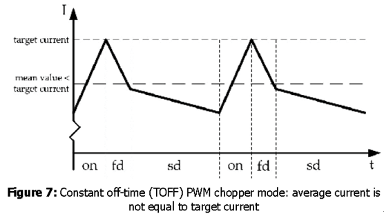 傳統(tǒng)的恒定PWM斬波模式是電流控制的PWM斬波模式,該模式在快速衰減和慢速衰減之間有個(gè)固定關(guān)系,在其最大數(shù)值的時(shí)候,電流才會(huì)達(dá)到規(guī)定的目標(biāo)電流,最終導(dǎo)致平均電流是小于預(yù)期目標(biāo)電流的,如圖7所示