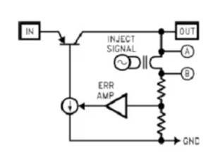 環(huán)路的不穩(wěn)定來自于相位移量,我們可以在反饋回路中通過變壓器注入正弦小信號,如下圖所示,Loop Gain=Va/Vb,從Vb傳入交流小信號,同過回路產(chǎn)生相移到達(dá)Va。這樣可以計(jì)算回路增益,相位的偏移量。(此處以LDO分析)