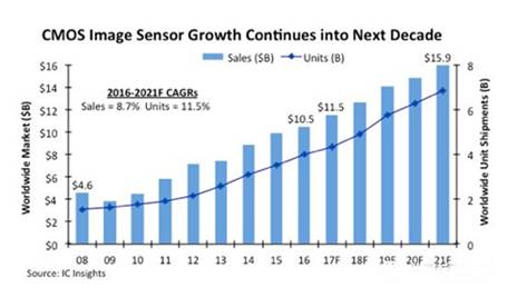 而根據(jù)IC Insights預(yù)計(jì),2017年CMOS圖像傳感器銷售額將增長9%,達(dá)到115億美元。2016年到2021年,CMOS圖像傳感器銷售額復(fù)合年均增長率在8.7%左右。2021年將增長至159億美元。