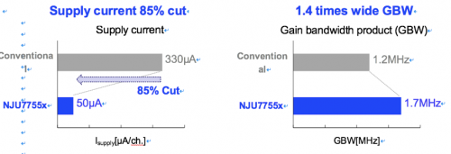 1. 擁有1.7MHz寬帶的同時,實現(xiàn)了1回路消耗電流僅有50μA的超低功耗