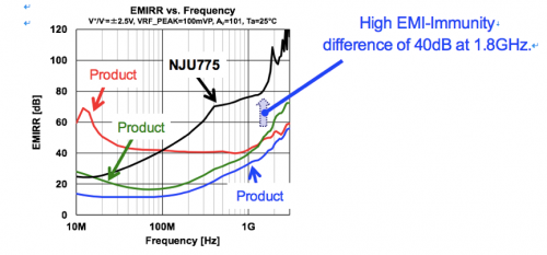 為了提高無線連接不斷發(fā)展的IoT及傳感器模塊等設(shè)備通信信息的可靠性,該運算放大器大大提高了抑制無線移動通信設(shè)備、便攜設(shè)備等產(chǎn)生的RF噪聲性能。