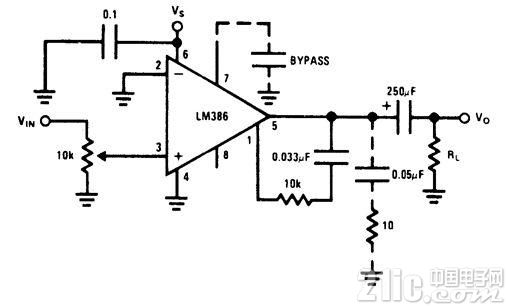 使用在引腳1和5之間的外部串聯(lián)RC電路和運放器的并聯(lián)內(nèi)部151K電阻,對揚聲器的低音響應差補償。如果電阻是15K,穩(wěn)定運行的最低值是10K,就可以得到6分貝的有效低音增強。