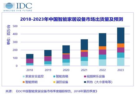 IDC最新發(fā)布的《IDC中國智能家居設(shè)備市場季度跟蹤報(bào)告》顯示,2018年中國智能家居市場累計(jì)出貨近1.5億臺,同比增長36.7%。其中第四季度出貨4610萬臺,同比增長45.4%。預(yù)計(jì)未來五年中國智能家居設(shè)備市場將持續(xù)快速增長,2023年市場規(guī)模將接近5億臺。