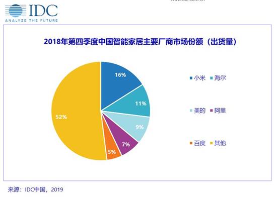 從市場競爭來看,中國智能家居設(shè)備市場玩家眾多,頭部廠商優(yōu)勢明顯!禝DC中國智能家居設(shè)備市場季度跟蹤報(bào)告》顯示,2018年第四季度中國智能家居設(shè)備出貨量前五位的廠商占有近半數(shù)的市場份額。其中小米依靠其完善的生態(tài)鏈成為最大玩家;海爾和美的作為傳統(tǒng)家電智能化的領(lǐng)頭羊分列第二、三位;阿里憑借自身渠道優(yōu)勢通過智能音箱和智能電視盒子兩個(gè)主要產(chǎn)品位列第四;百度入局較晚,但在DuerOS語音平臺的支持下通過智能音箱這一爆款產(chǎn)品,僅三個(gè)季度便躋身前五。