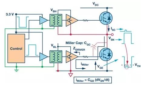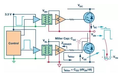 除了系統(tǒng)故障導(dǎo)致的短路,瞬時(shí)逆變器直通同樣會(huì)發(fā)生在正常工作條件下。此時(shí),IGBT導(dǎo)通要求IGBT驅(qū)動(dòng)至飽和區(qū)域,在該區(qū)域中導(dǎo)通損耗最低。這通常意味著導(dǎo)通狀態(tài)時(shí)的柵極-發(fā)射極電壓大于12 V。IGBT關(guān)斷要求IGBT驅(qū)動(dòng)至工作截止區(qū)域,以便在高端IGBT導(dǎo)通時(shí)成功阻隔兩端的反向高電壓。原則上講,可以通過(guò)使IGBT柵極-發(fā)射極電壓下降至0 V實(shí)現(xiàn)該目標(biāo)。但是,必須考慮逆變器臂上低端晶體管導(dǎo)通時(shí)的副作用。導(dǎo)通時(shí)開(kāi)關(guān)節(jié)點(diǎn)電壓的快速變化導(dǎo)致容性感應(yīng)電流流過(guò)低端IGBT寄生密勒柵極-集電極電容(圖3中的CGC)。該電流流過(guò)低端柵極驅(qū)動(dòng)器(圖3中的ZDRIVER)關(guān)斷阻抗,在低端IGBT柵極發(fā)射極端創(chuàng)造出一個(gè)瞬變電壓增加,如圖所示。如果該電壓上升至IGBT閾值電壓VTH以上,則會(huì)導(dǎo)致低端IGBT的短暫導(dǎo)通,從而形成瞬態(tài)逆變器臂直通——因?yàn)閮蓚(gè)IGBT都短暫導(dǎo)通。這一般不會(huì)破壞IGBT,但卻能增加功耗,影響可靠性。