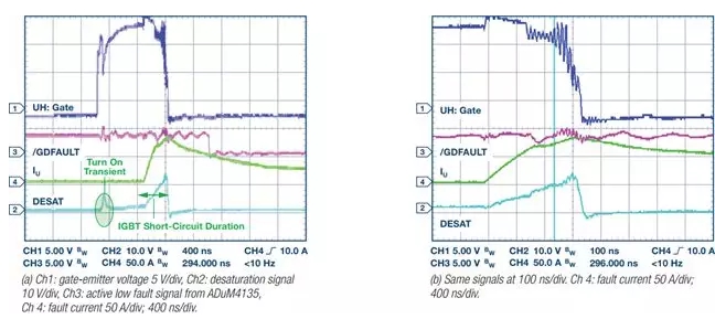 實(shí)驗(yàn)設(shè)置采用三相逆變器,該逆變器由交流市電通過(guò)半波整流器供電。雖然系統(tǒng)最高可采用800 V的直流總線電壓,但本例中的直流總線電壓為320 V。正常工作時(shí),0.5 HP感應(yīng)電機(jī)由開(kāi)環(huán)V/Hz控制驅(qū)動(dòng)。IGBT采用International Rectifier提供的1200 V、30 AIRG7PH46UDPBF?刂破鞑捎肁DI的ADSP-CM408F Cortex®-M4F混合信號(hào)處理器。使用隔離式Σ-Δ AD7403調(diào)制器進(jìn)行相位電流測(cè)量,使用ADuM4135實(shí)現(xiàn)隔離式柵極驅(qū)動(dòng)(它是一款磁性隔離式柵極驅(qū)動(dòng)器產(chǎn)品,集成去飽和檢測(cè)、米勒箝位和其它IGBT保護(hù)功能)。在電機(jī)相位之間,或在電機(jī)相位和負(fù)直流總線之間手動(dòng)開(kāi)關(guān)短路,進(jìn)行短路測(cè)試。 本例中未測(cè)試短路至地。