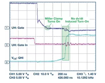 圖9顯示了正常工作時(shí),米勒箝位防止逆變器直通的價(jià)值。
