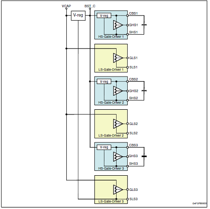 The integrated boost regulator provides sufficient gate charge for all PowerMOS down to a battery voltage of 6 V. All pre-drivers have dedicated connections with the MOSFET sources. The device offers programmability for a base gate output current via an external resistor. Moreover, via SPI, it is possible to select among 4 gate output current levels even while the application is running. All channels are protected against short circuit and the device is protected against overtemperature conditions. Moreover, the boost converter implements an over voltage protection to allow safe functionality of pre-drivers in all battery voltage conditions. During over voltage conditions, BST_C voltage is limited by temporarily switching off the boost regulator and pre-drivers are allowed to operate. Boost will be self re-enabled as soon as the output voltage decreases to an acceptable value.