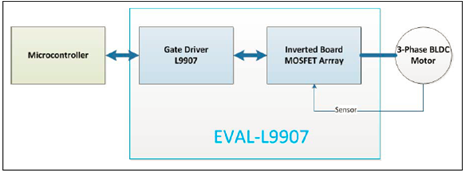 The EVAL-L9907 is an evaluation board designed to provide the user a platform for the L9907, a FET driver for 3 phase BLDC motor. The board offers all the main input/output capabilities needed to drive a BLCD motor properly and to provide diagnostic functionalities.