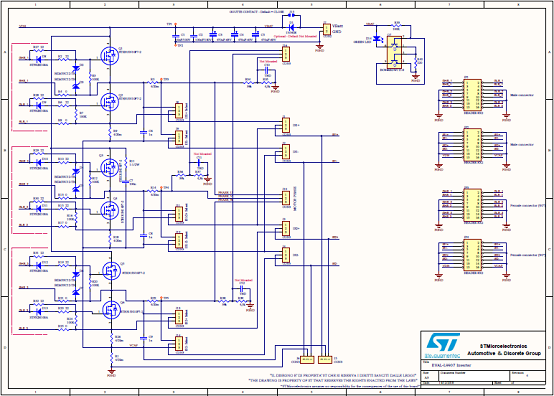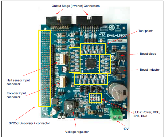 The main features are: Total accessibility to all device pins (both L9907 and the Inverter MOSFET board).Two separated boards: gate driver with L9007 and Inverter Power MOSFET boards with the MOSFET array. This HW architecture allows the user to evaluate the application with different HW configurations. Output power board current capability up to 20A.Full HW compatibility with the SPC56 discovery boards through the standard SPC56 Discovery+ connector, 0.1” - 4x36 pin.Possibility to connect generic microcontroller boards(a) by using a customized adapter.