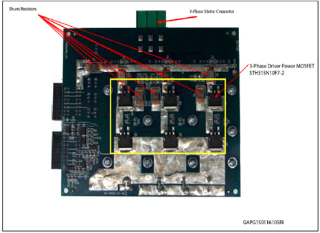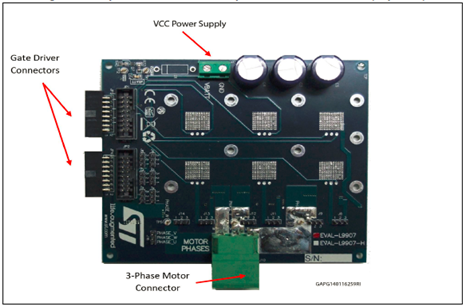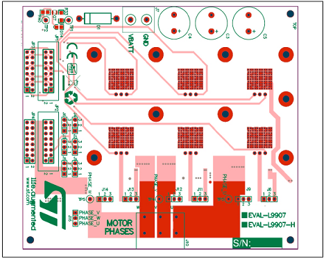 Standard connectors connect the gate driver board (L9907) and Inverter Power MOSFET output stage; this solution allows simplifying the evaluation procedure and it increases the flexibility of the HW environment.