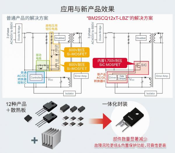 本產(chǎn)品采用一體化封裝,相比采用Si-MOSFET的普通分立結(jié)構(gòu),部件數(shù)量顯著減少,1個封裝內(nèi)包含多達(dá)12種產(chǎn)品(AC/DC轉(zhuǎn)換器控制IC、800V耐壓Si-MOSFET×2、齊納二極管×3、電阻器×6)和散熱板。另外,由于SiC MOSFET具有高耐壓、抗干擾性能優(yōu)異的特點,還可實現(xiàn)降噪部件的小型化。