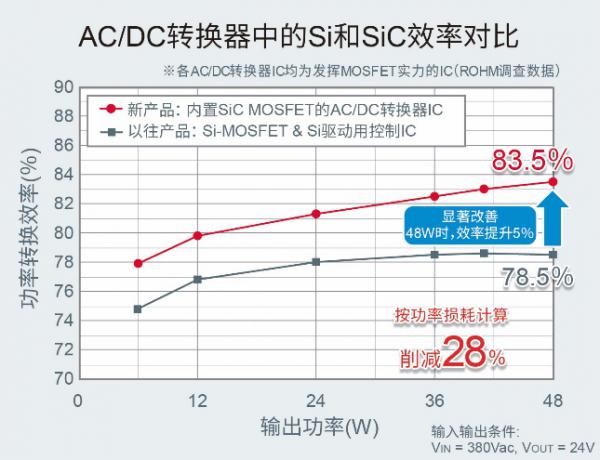 在高耐壓范圍中,SiC MOSFET與Si-MOSFET相比,具有“開關(guān)損耗與導(dǎo)通損耗小”、“可支持大功率”、“耐溫度變化”等優(yōu)勢。基于這些優(yōu)勢,當(dāng)SiC-MOSFET用于AC/DC轉(zhuǎn)換器和DC/DC轉(zhuǎn)換器等中時,可帶來更高的功率轉(zhuǎn)換效率、散熱器件的小型化、高頻工作使線圈更小等好處,具有更節(jié)能、部件數(shù)量更少、安裝面積更小等效果。