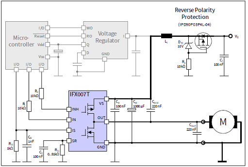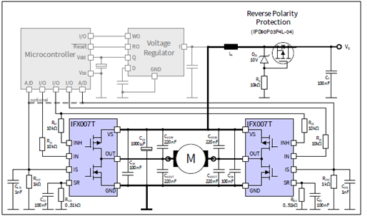 圖2. IFX007T應(yīng)用電路:兩個(gè)IFX007T組成H橋