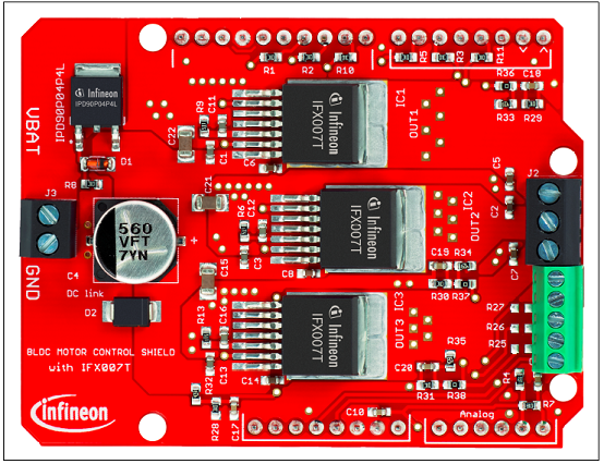 The application targeted by the IFX007T devices is brushed DC/brushless DC Motor Control. Besides MotorControl any other inductive, resistive and capacitive load within the electrical characteristics of the NovalithIC™can be driven by the IFX007T. In the Motor Control Shield three IFX007T are used. Each is capable of driving up to 55 A. The limited thermal performance of the Shield PCB limits the recommended maximum current to 30 A.