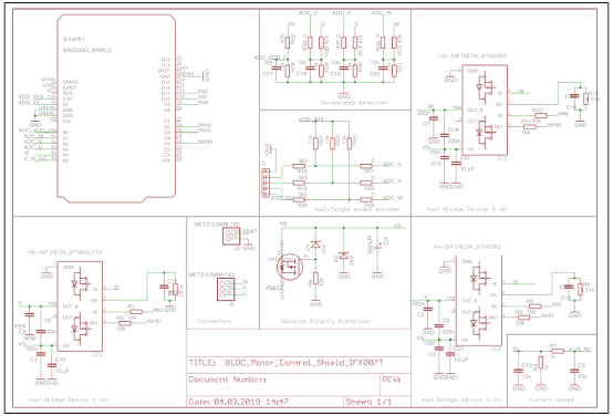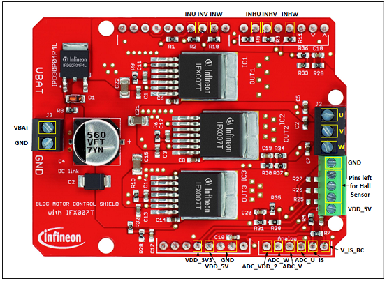 • An Arduino Uno, XMC1100 Boot Kit, or similar board connected to the shield can control the three halfbridgesvia the general IO pins.