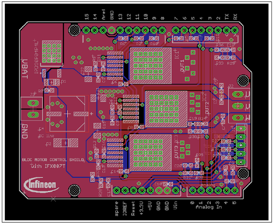 The Motor Control Shield adds powerful motor control to the Arduino projects. The shield can be controlledwith the general logic IO-Ports of a microcontroller. Either an Arduino Uno or the XMC1100 Boot Kit fromInfineon can be used as the master.On board of the Motor Control Shield are three IFX007T NovalithICTM. Each is featuring one P-channel high sideMOSFET and one N-channel low side MOSFET with an integrated driver IC in one package. Due to the P-channelhigh side switch a charge pump is not needed.