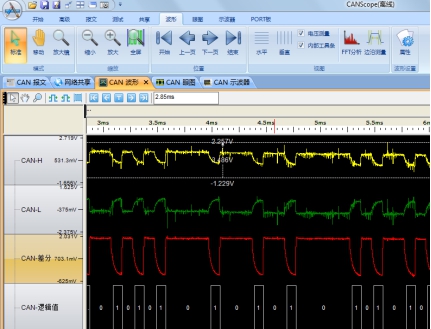 負(fù)載率過高,總線節(jié)點(diǎn)多,造成總線網(wǎng)線的分布電容很大,體現(xiàn)在下降沿非常緩,如圖4所示,顯性電平回到隱性電平需要的放電時間加大。對信號來說就是會縮短隱性電平時間,容易導(dǎo)致位錯誤。
