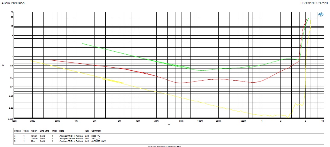 小功率測試,整個(gè)音頻范圍,MIX3901失真度最小,0.01%~0.02%之間;ANT8829在中低頻部分比HT8699好;HT8699在中高頻部分比ANT8829好。