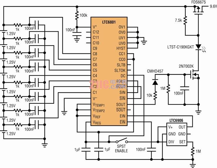 不妨考慮使用 LTC6801,這是一款專為應(yīng)對上述特定問題而開發(fā)的集成解決方案。LTC6801 能夠檢測多達(dá) 12 個(gè)串接電池組電池的過壓 (OV) 和欠壓 (UV) 情況,并利用可級聯(lián)的互連線來處理擴(kuò)展的器件鏈,所有這些均無需借助任何的微處理器支持。