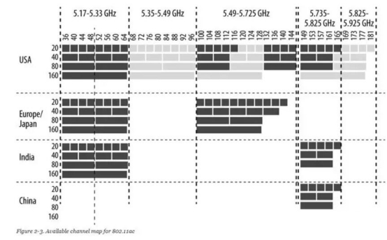 5GHz頻段的范圍比起2.4GHz無(wú)疑要寬廣得多,覆蓋范圍實(shí)際上是4.9GHz到5.8GHz,信道的劃分也更多樣化,不過(guò)有一個(gè)標(biāo)準(zhǔn)是不變的,那就是信道對(duì)應(yīng)的中心頻率提升5MHz,信道的編號(hào)就加1,這點(diǎn)與2.4GHz頻段信道劃分的標(biāo)準(zhǔn)基本一致的。目前支持5GHz頻段的無(wú)線路由器多數(shù)使用的是低36號(hào)信道到第165號(hào)信道,對(duì)應(yīng)頻率為5.17GHz之5.825GHz,單從頻道數(shù)來(lái)說(shuō),即使要考慮地區(qū)和設(shè)備的兼容性問(wèn)題,5GHz實(shí)際可以使用的信道也比2.4GHz要多出許多。