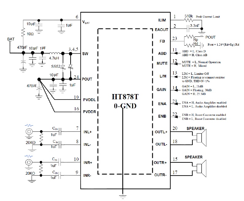 HT878 2X8.5W/2.7V-5.5V(內置自適應升壓模塊)/4Ω TSSOP-24 2.5V-5.5V 可任意限幅、單節(jié)鋰電池內置升壓的8W雙聲道音頻功放IC