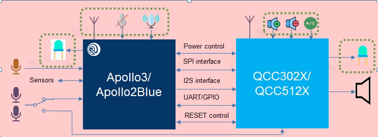 硬件框架如圖1,主要由低功耗MCU+高音質(zhì)藍(lán)牙芯片+Sensor傳感器構(gòu)成,低功耗MCU負(fù)責(zé)聲音檢測以及關(guān)鍵詞檢測等功能,藍(lán)牙芯片負(fù)責(zé)高品質(zhì)音頻播放以及藍(lán)牙通話功能,傳感器則檢測耳機的狀態(tài),如耳機在充電盒中或者佩戴在人耳上等。