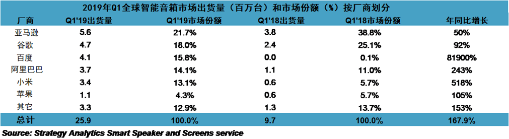 Strategy Analytics最新發(fā)布的研究報(bào)告指出,2019年Q1中國智能音箱的銷量同比增長超過500%。 這推動了全球智能音箱Q1的銷量增至2590萬臺,比2018年同比增長168%。盡管亞馬遜和谷歌仍分別位居第一和第二,但中國品牌的全球市場份額已接近亞馬遜和谷歌。 春節(jié)期間的促銷活動推動了中國的需求增長,而百度的小度在家智能顯示器尤其受歡迎。 Strategy Analytics現(xiàn)已將2019年全年全球出貨量預(yù)測上調(diào)10%至1.477億臺。