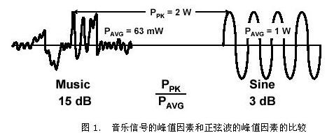 從圖中可以看出,假定音樂信號和正弦波的峰值功率都是2瓦,因為正弦波的峰值功率和有效值功率之比為3dB,所以正弦波的平均功率為1瓦,而音樂信號的峰值因素大約為15dB,所以其平均功率就只有63毫瓦。