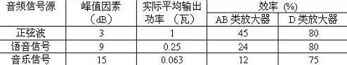 假定其峰值功率為2瓦,那么對于正弦波的平均功率就是1瓦,而對于峰值因素為9dB的語音信號,其平均功率就只有0.25瓦,而對于峰值因素為15dB的音樂信號來說,其平均功率就只有0.063瓦。它們在用AB類和D類放大器播放的時候,在效率上的差異就十分巨大。