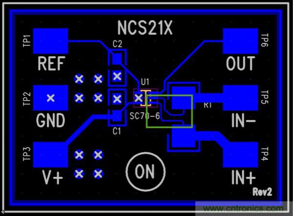 圖1:NCS21xR客戶評(píng)估PCB布板提供優(yōu)化的并聯(lián)電阻連接