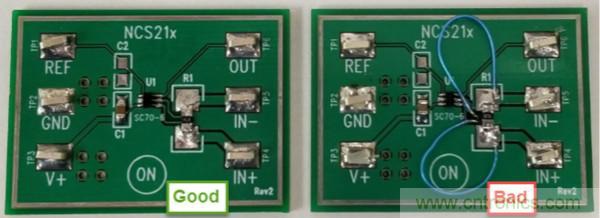 圖2:NCS213R客戶評(píng)估板:正確與錯(cuò)誤的分路連接對(duì)比