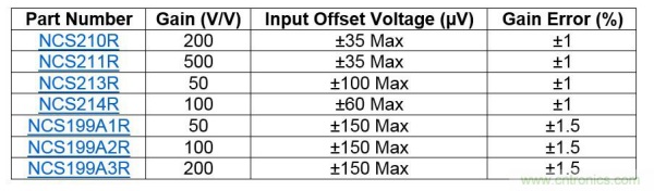 表2:NCS21xR和NCS199AxR系列電流檢測放大器
