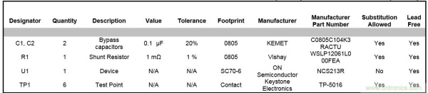 表3:NCS213R客戶評(píng)估板(PCB)物料單(BOM)