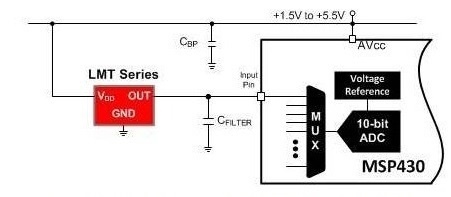 模擬溫度傳感器是一個有源半導(dǎo)體器件,它的輸出是與溫度成比例的電壓值或電流值。作為一個集成電路 (IC),模擬溫度傳感器具有熱敏電阻所不具備的內(nèi)置智能性,從而使與模擬溫度傳感器有關(guān)的設(shè)計工作變得簡單。圖3顯示了其中一款TI LMT系列模擬溫度傳感器的典型應(yīng)用,在這個應(yīng)用中,只有IC,而未使用外部組件。