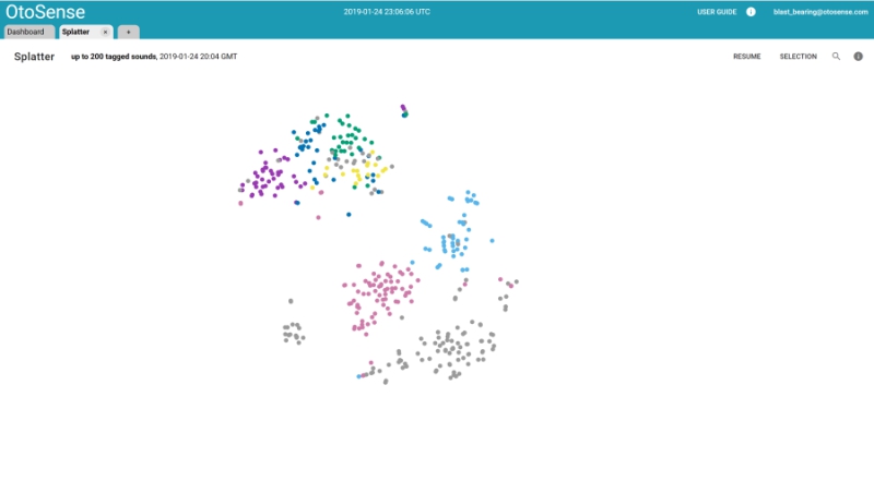 OtoSense Sound Platter(也稱為 splatter)允許通過完整概述數(shù)據(jù)集來探索和標(biāo)記聲音。Splatter 在完整的數(shù)據(jù)集中選擇最有趣和最具代表性的聲音,并將它們顯示為一個混合了標(biāo)記和未標(biāo)記聲音的 2D 相似性地圖。