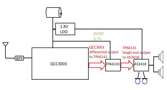 由基于Qualcomm的ANC主動(dòng)式抗噪藍(lán)牙耳機(jī)所使用的是類(lèi)比式的處理方式,抗噪麥克風(fēng)需經(jīng)過(guò)一連串的RLC組合而成的ANC filter來(lái)達(dá)到抗噪功能,若ANC的low pass filter需求極為強(qiáng)烈,則所需的RLC串會(huì)更為復(fù)雜,所需的layout空間也會(huì)越大。QCC3003是一顆支持BT5.0 entry level的flash type立體聲藍(lán)牙耳機(jī)chipset,QFN包裝有利于layout的簡(jiǎn)化,藍(lán)牙硬件部分的design凝聚了FAE們的豐富經(jīng)驗(yàn),軟件部分通過(guò)QCC3003的I2C來(lái)控制AS3418 ANC的on&off,大大地減輕了客戶欲應(yīng)用此方案可能產(chǎn)生的資源消耗。用戶只需要來(lái)fine tune QCC3003的one MIC cVc,因?yàn)槊恐欢鷻C(jī)具有不同的聲學(xué)結(jié)構(gòu),不同的MIC位置需要做的fine tune來(lái)達(dá)成該耳機(jī)最優(yōu)化的echo cancel跟noise reduction表現(xiàn)。