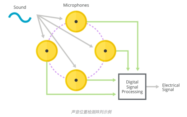MEMS麥克風(fēng)陣列還可用于確定聲音相對于陣列的方向。在本應(yīng)用的一種常見實現(xiàn)中,麥克風(fēng)會被放置在圓圈或球面的周邊上。采用電子信號處理識別各個麥克風(fēng)發(fā)出的所需信號,同時可以借助在各個麥克風(fēng)之間傳送的所需信號的相對時間延遲,確定相對于麥克風(fēng)陣列的聲音源。