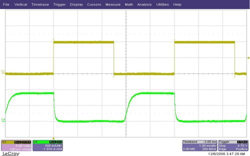 透過軟啟動電容器 C5 的短路快速地開/關(guān)轉(zhuǎn)換器,是調(diào)節(jié) LED 亮度一種簡單的方法。圖 2 顯示了 PWM 輸入訊號和實(shí)際的 LED 電流。這種 PWM 亮度調(diào)節(jié)方法較為有效,因?yàn)檗D(zhuǎn)換器關(guān)閉并且在 SS 接腳短路時僅消耗極少的功率。但是這種方法也相對較慢,因?yàn)檗D(zhuǎn)換器每次開啟時都必須以一種可控制方式逐漸升高輸出電流,進(jìn)而在輸出電流上升以前產(chǎn)生一個非線性、有限的停滯時間 (dead-time)。同時,這也將開啟時間的最小負(fù)載周期降低至 10%-20%。在一些不要求高速和 100% PWM 調(diào)節(jié)的 LED 應(yīng)用中,這種方法或許就已足夠。