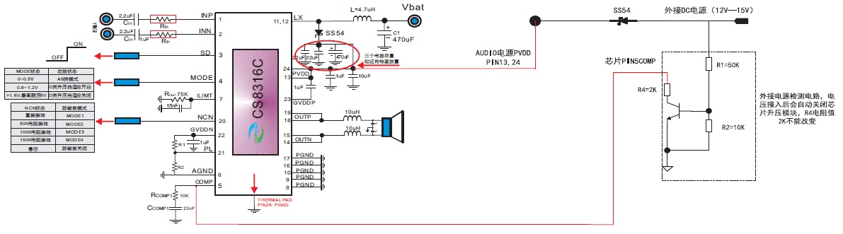 在兩節(jié)鋰電供電的拉桿音箱應(yīng)用中,普遍需要外接12V的電源,CS8316C支持兩節(jié)鋰電/12V鉛酸電池雙電源供電,推薦應(yīng)用電路圖如下: