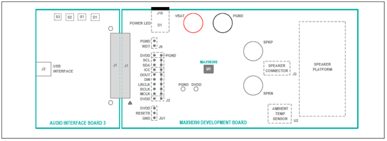 It is recommended that the DEV board be evaluated with the AUDINT3 board as an EV system. MAX98390 supports standard I2S, left-justified, and TDM digital audio interfaces, as well as I2C for control.