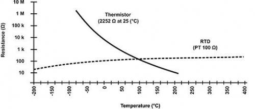 從圖中可以看出,與鉑合金RTD相比,NTC熱敏電阻具有更陡的電阻 - 溫度斜率,這轉(zhuǎn)化為更好的溫度靈敏度。即便如此,RTD仍然是最精確的傳感器,其精度為測量溫度的±0.5%,并且它們在-200°C和800°C之間的溫度范圍內(nèi)使用,比NTC溫度傳感器的范圍寬得多。