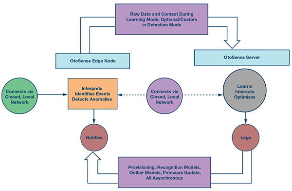 OtoSense 在終端位置實施異常檢測和事件識別,無需使用任何遠程設(shè)備。這種結(jié)構(gòu)確保系統(tǒng)不會受到網(wǎng)絡(luò)故障的影響,且無需將所有原始數(shù)據(jù)塊發(fā)送出去進行分析。運行 OtoSense 的終端設(shè)備是一種自包含系統(tǒng),可以實時描述所鑒聽設(shè)備的行為。